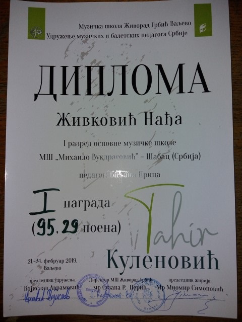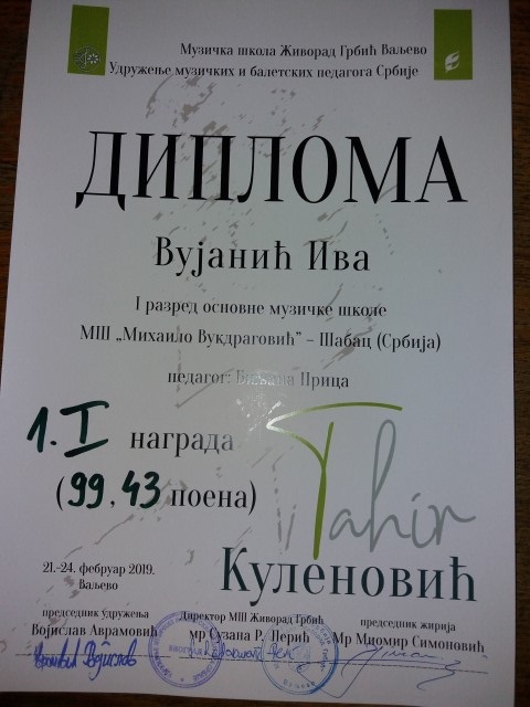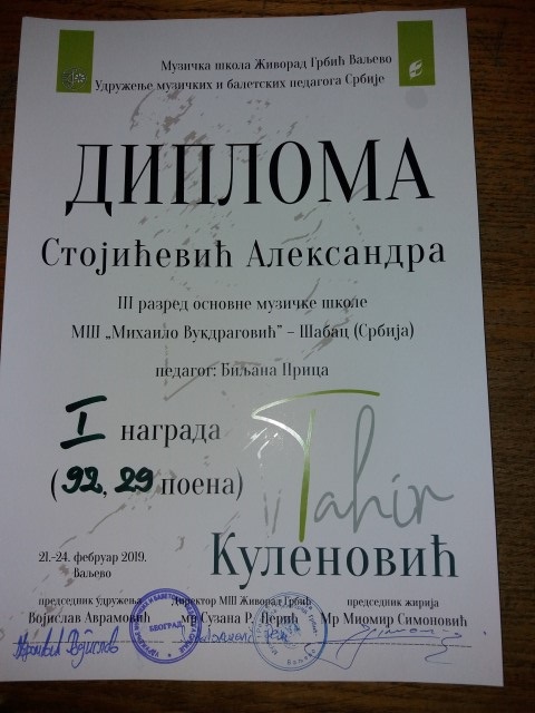 Učenica iz moje klase, Jana Ilić, i uz pomoć klavirske saradnje Miloša Milutinović osvojila je predkategoriji I nagradu (100 bodova)